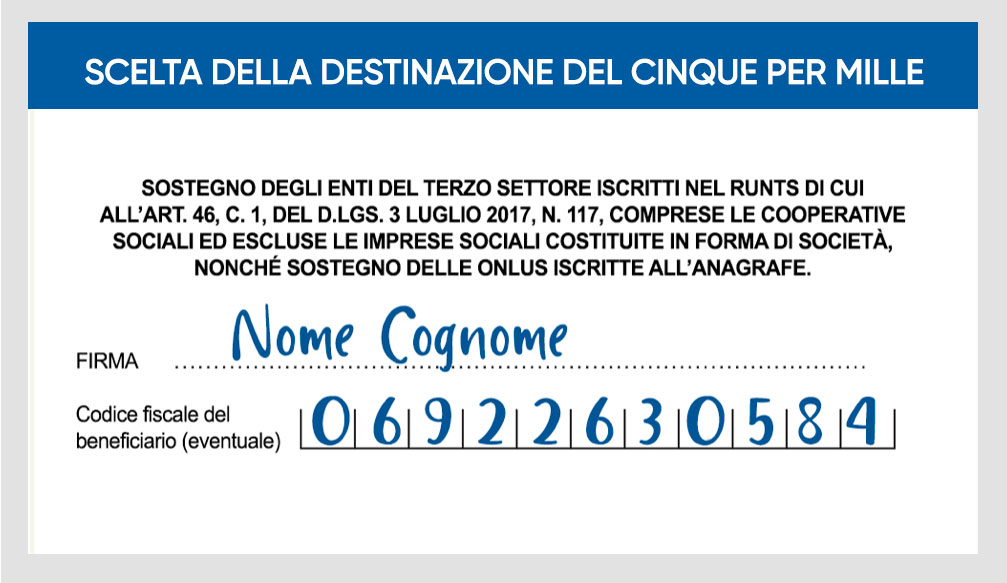 Firma e inserisci il nostro codice fiscale nel riquadro dedicato della scheda per la destinazione del 5×1000 della dichiarazione dei redditi.