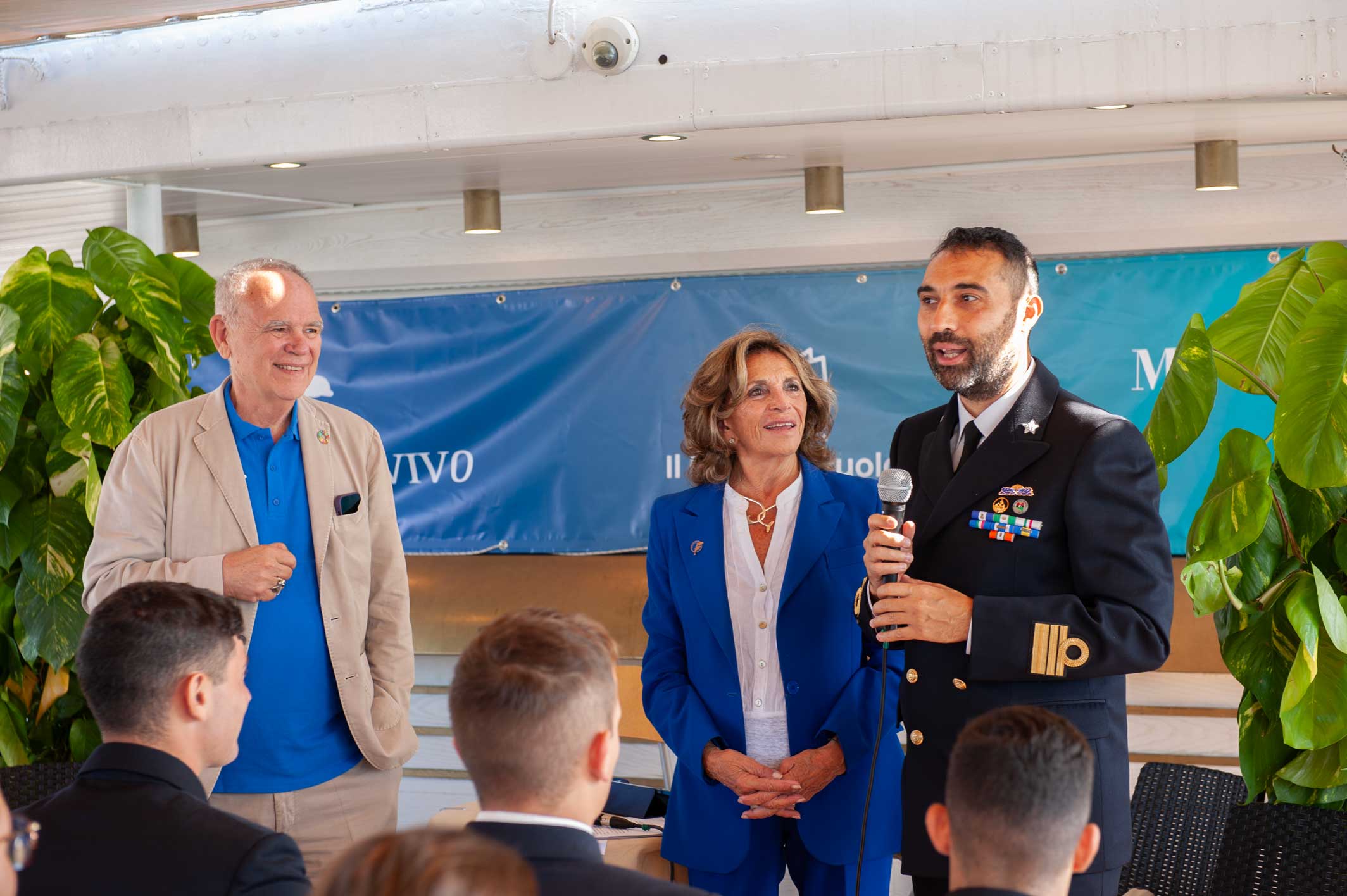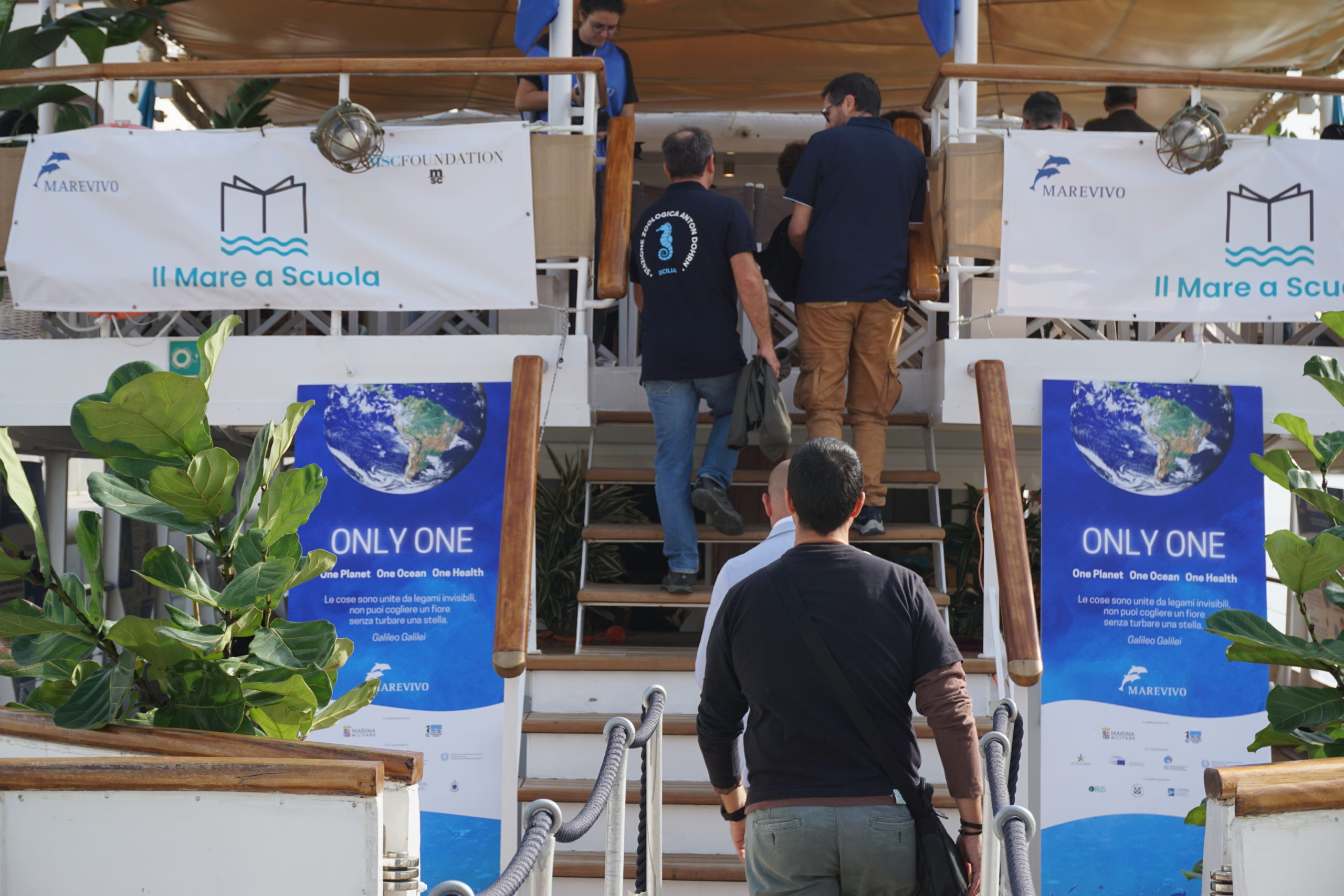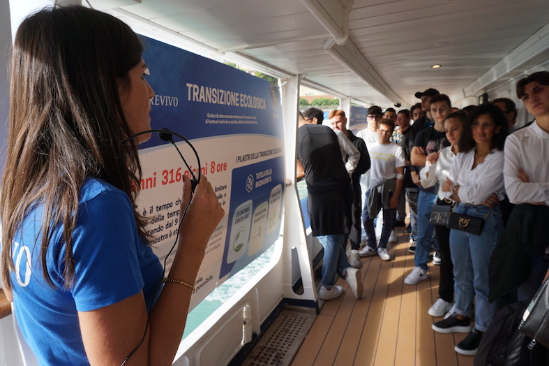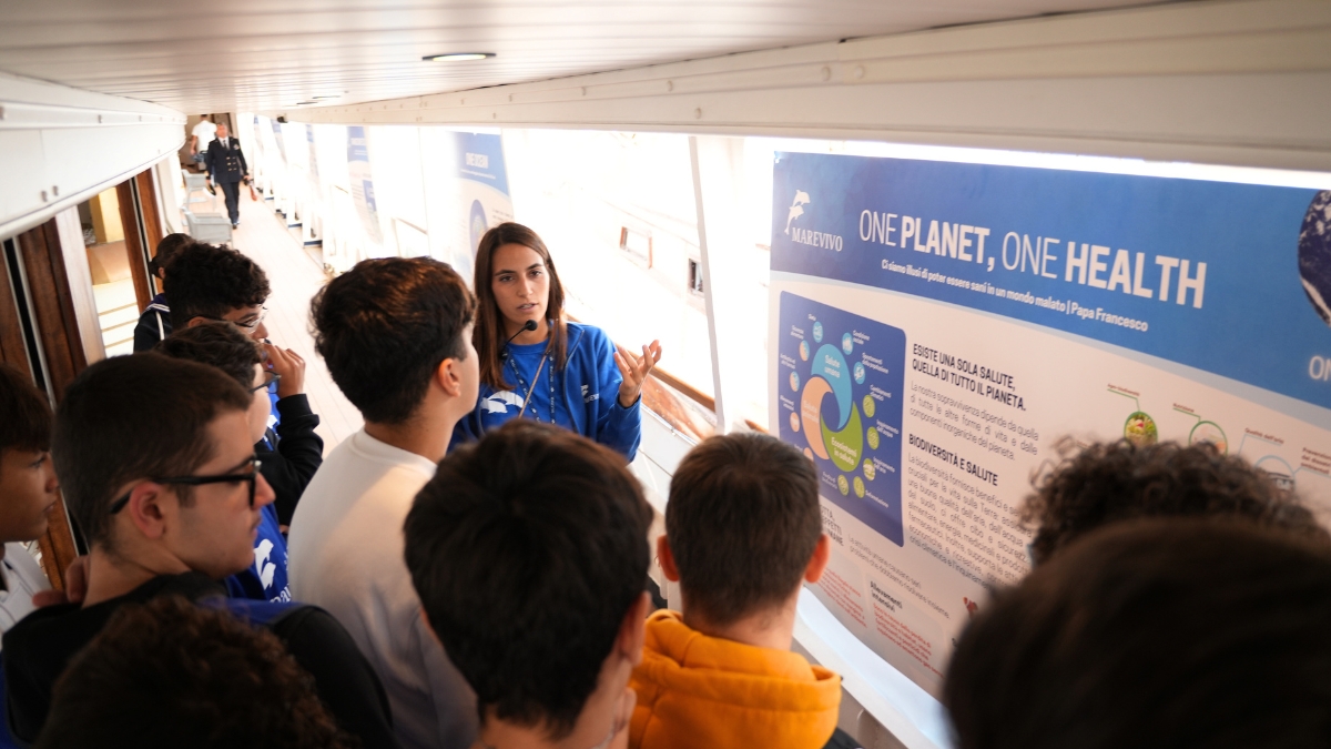 Sulla Motonave Patrizia presente anche la mostra itinerante di Marevivo “Only One – One Planet, One Ocean, One Health” sulla transizione ecologica, attualmente ospitata sulle navi scuola della Marina Militare Palinuro e Amerigo Vespucci.