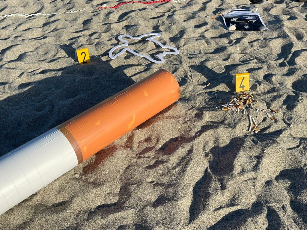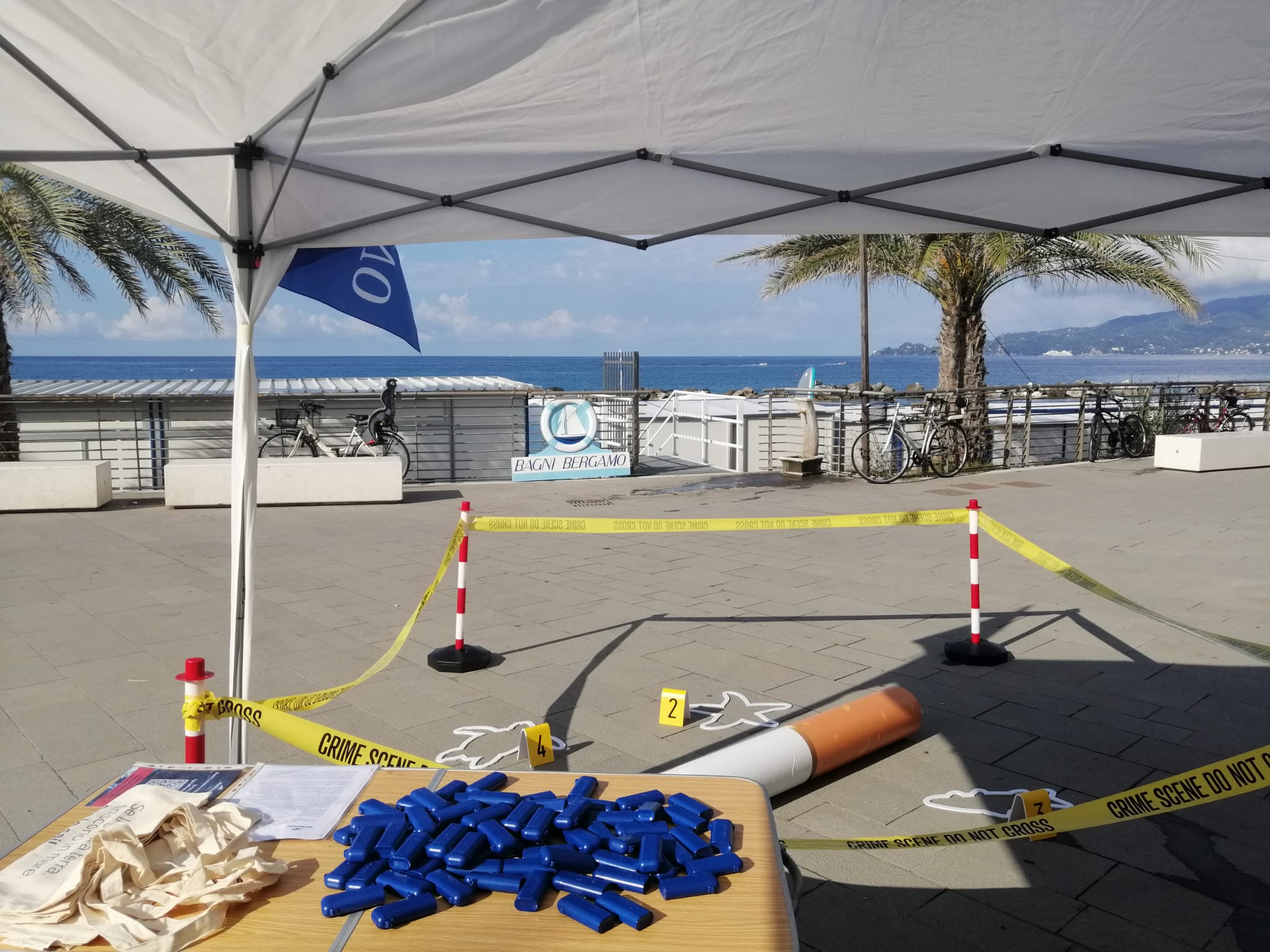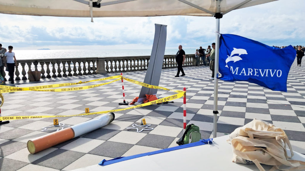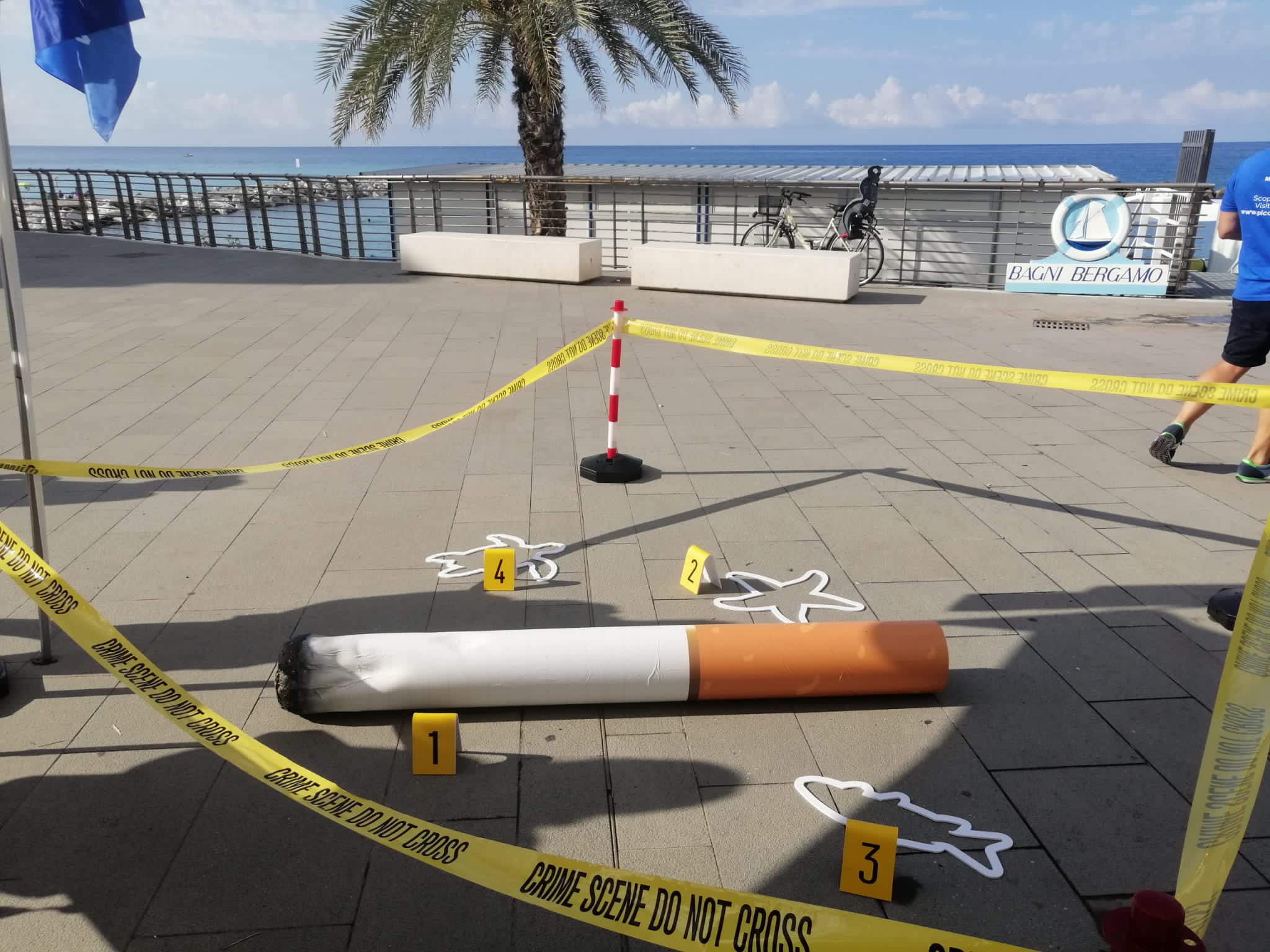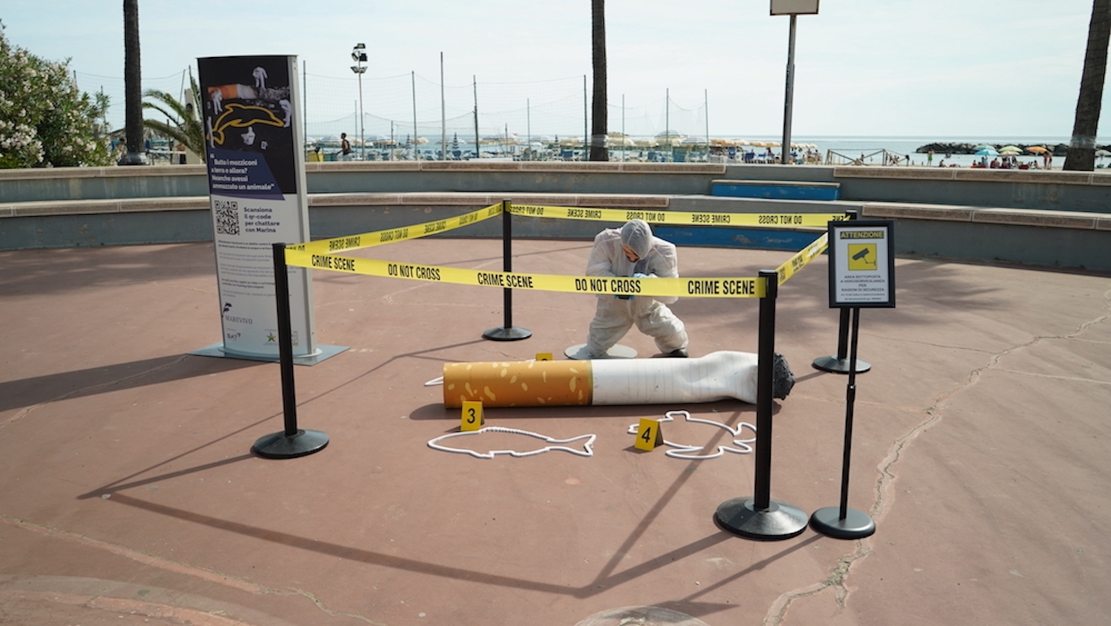 Per il 2022, nella "scena del crimine" accanto alle vittime - raffigurate da sagome di pesci, tartarughe e stelle marine – la simbolica arma del delitto non è stata rappresentata solo dal mozzicone gigante, ma anche dagli altri piccoli rifiuti, soprattutto di plastica, che si trovano nelle nostre città e che finiscono sulle spiagge e nel mare.