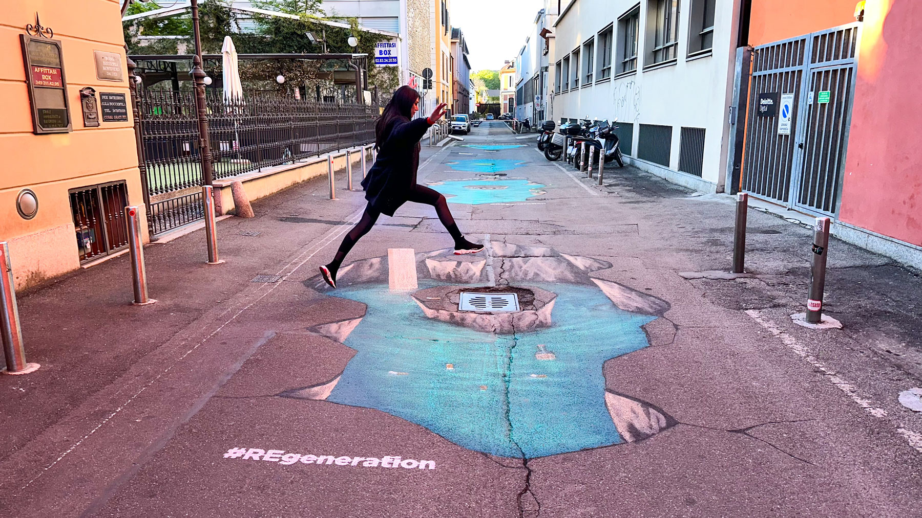 5 opere sequenziali, un solo percorso immersivo per stimolare la cultura ambientale, in via Gaspare Bugatti a Milano per ammirare e interagire con # REgeneration, l’opera di Street Art anamorfica firmata Cheone.