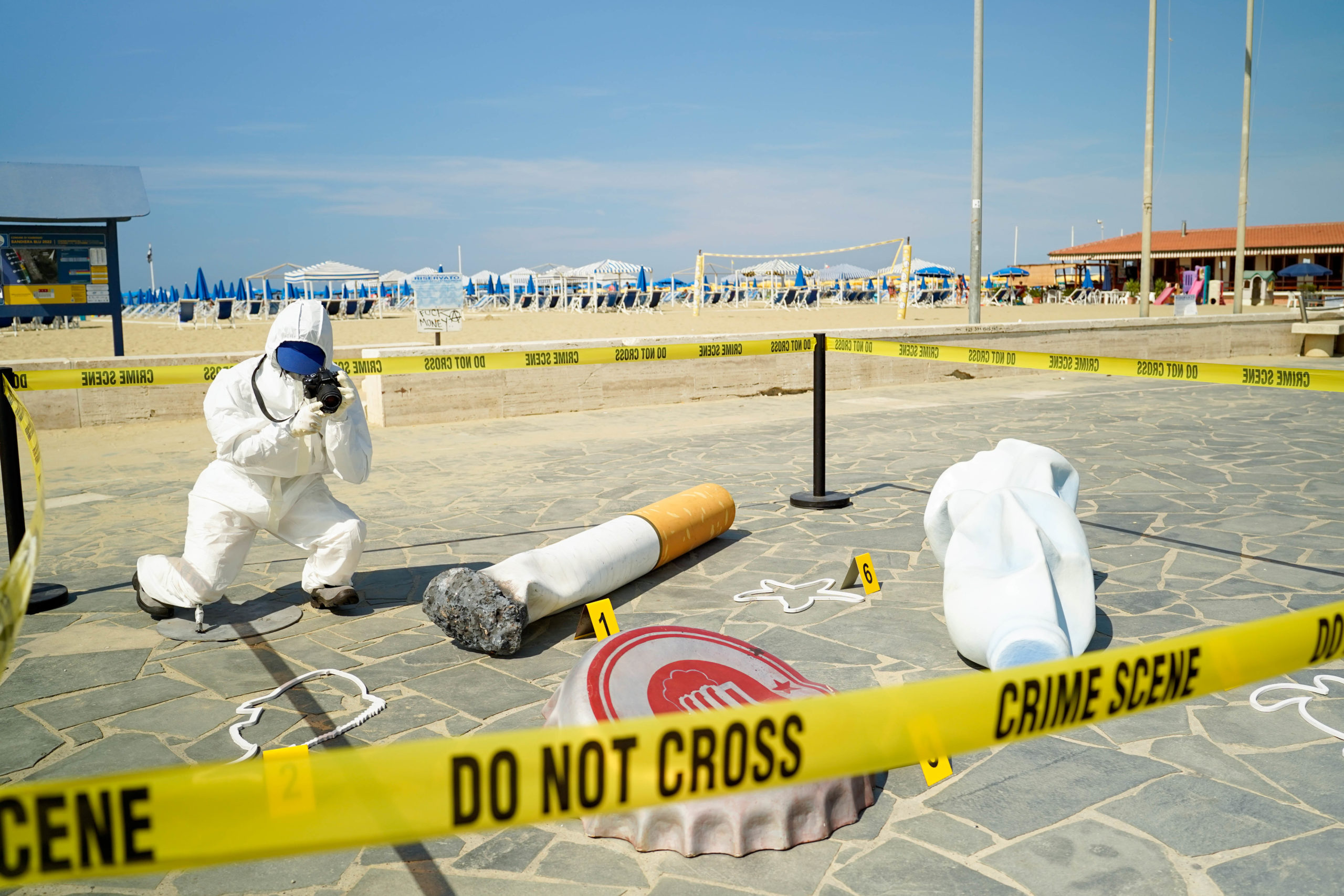 E proprio con l’obiettivo di sensibilizzare i cittadini sul tema del littering di mozziconi e piccoli rifiuti, la campagna “Piccoli gesti, grandi crimini” fa leva sul concetto di crimine commesso da chi compie questo “piccolo” gesto, rappresentandolo con un’installazione dal grande impatto visivo: una «scena del crimine» in cui, accanto alle sagome delle vittime raffiguranti pesci, tartarughe e altri animali marini, viene posta la riproduzione di un mozzicone gigante e di altri rifiuti come simboliche “armi del delitto”.