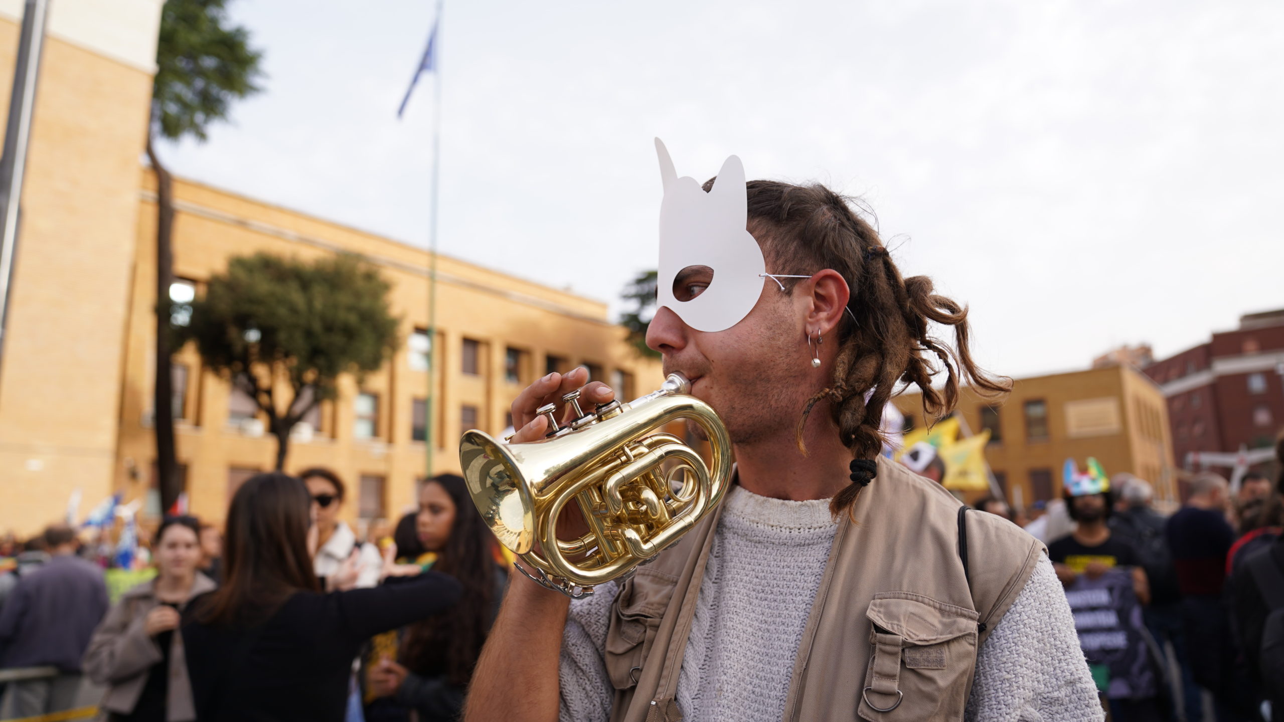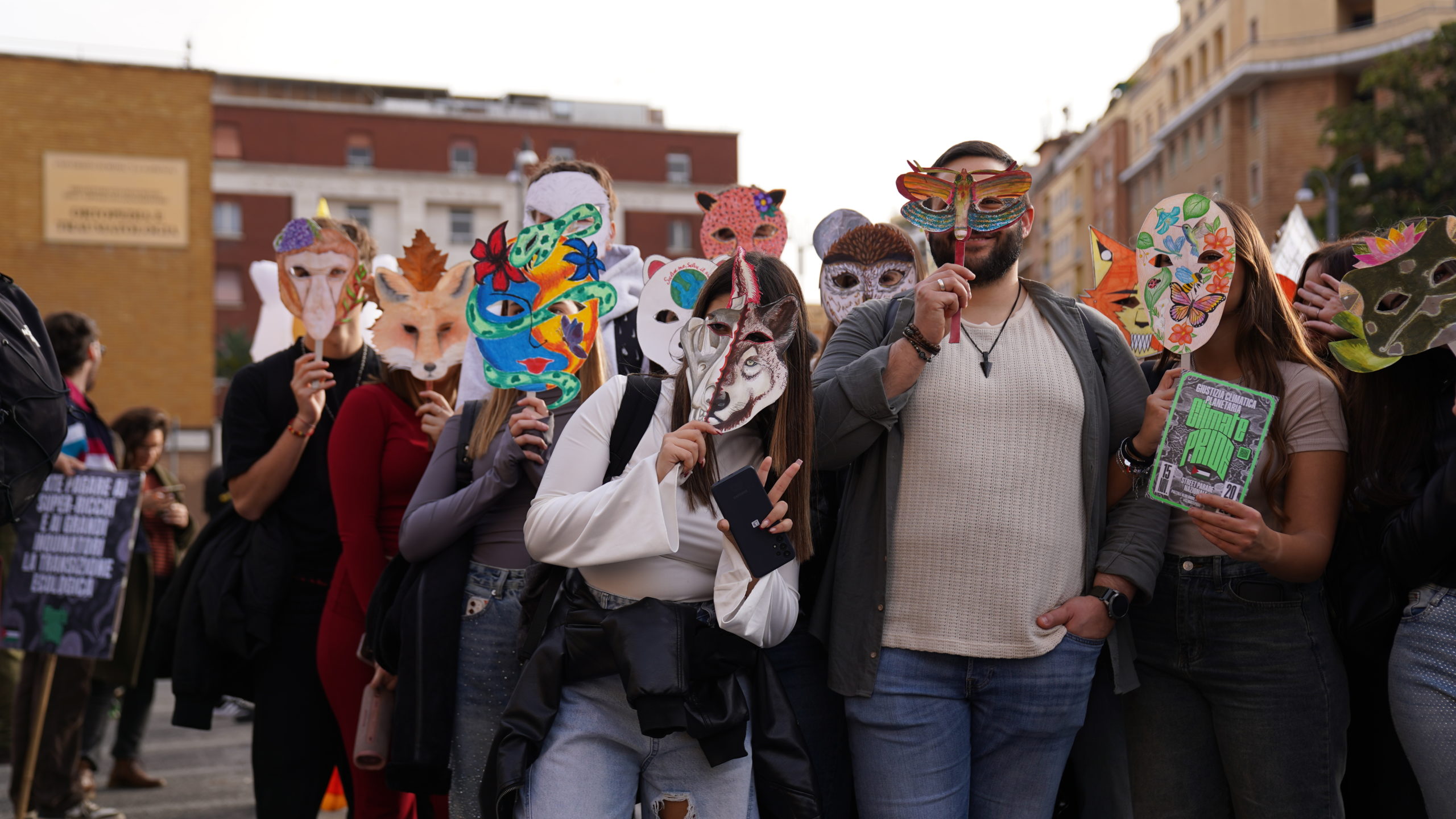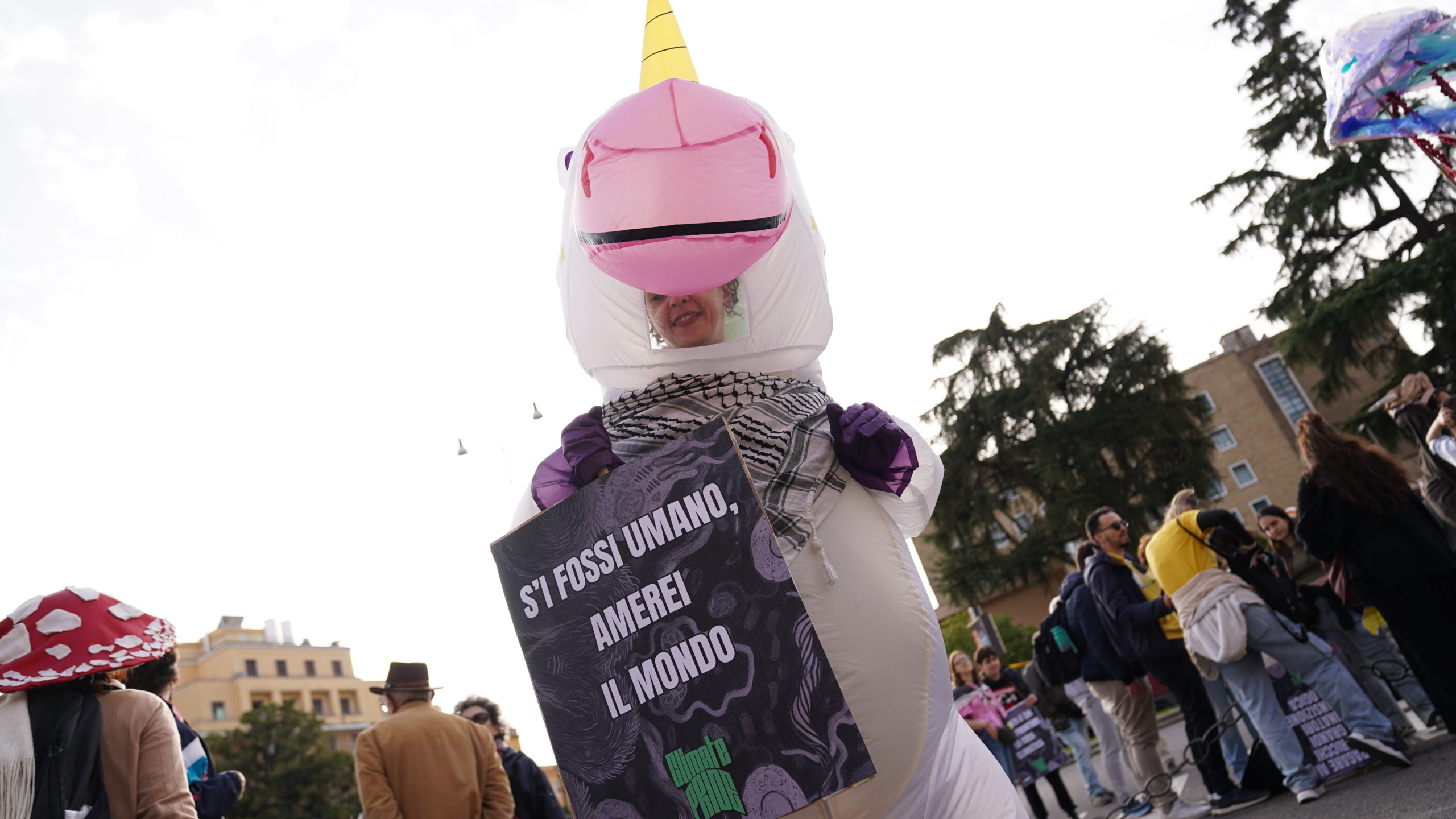 Sabato scorso si sono riunite in piazza a Roma, migliaia di persone, tra associazioni, movimenti, cittadine e cittadini, che hanno formato una lunga street parade performativa con maschere di organismi, pale eoliche, la scenografia di un antico ulivo palestinese e lo striscione “Dall’Amazzonia all’Europa Giustizia Climatica Planetaria”. È partita da Piazzale Aldo Moro ed è confluita a Largo Preneste, zona est della Capitale, per chiedere ai leader politici riuniti alla COP30 di Belém una svolta concreta nelle politiche climatiche e sociali.