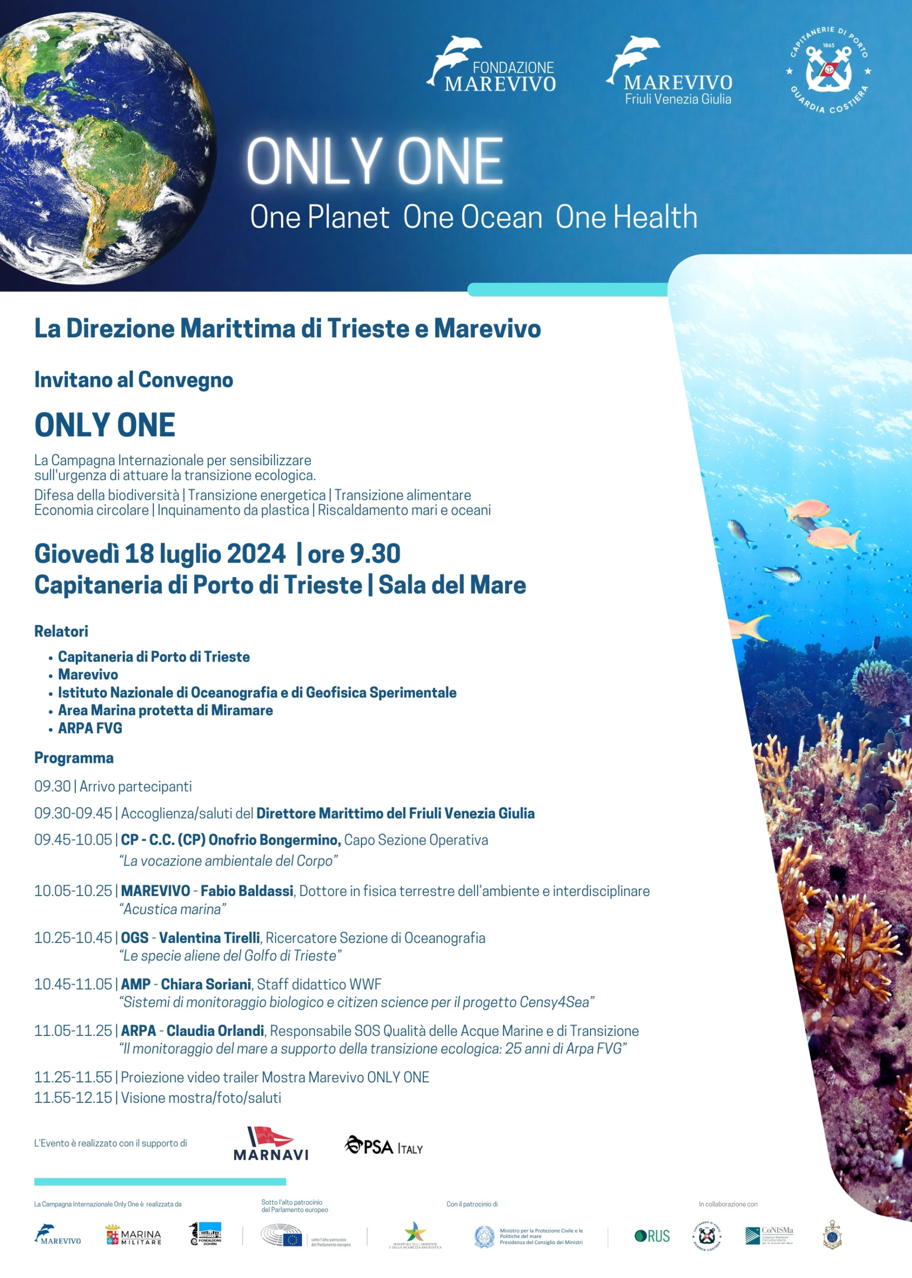 Diversi gli enti tecnico-scientifici in ambito regionale presenti all’incontro: l’Istituto Nazionale di Oceanografia e di Geofisica Sperimentale (OGS), l’Area Marina Protetta di Miramare (AMP) e l’Agenzia regionale per la protezione dell’ambiente del Friuli Venezia Giulia (ARPA), che hanno arricchito e stimolato il dibattito sui quattro temi principali della campagna di Marevivo “Only One”: tutela della biodiversità, transizione energetica e alimentare ed economia circolare.