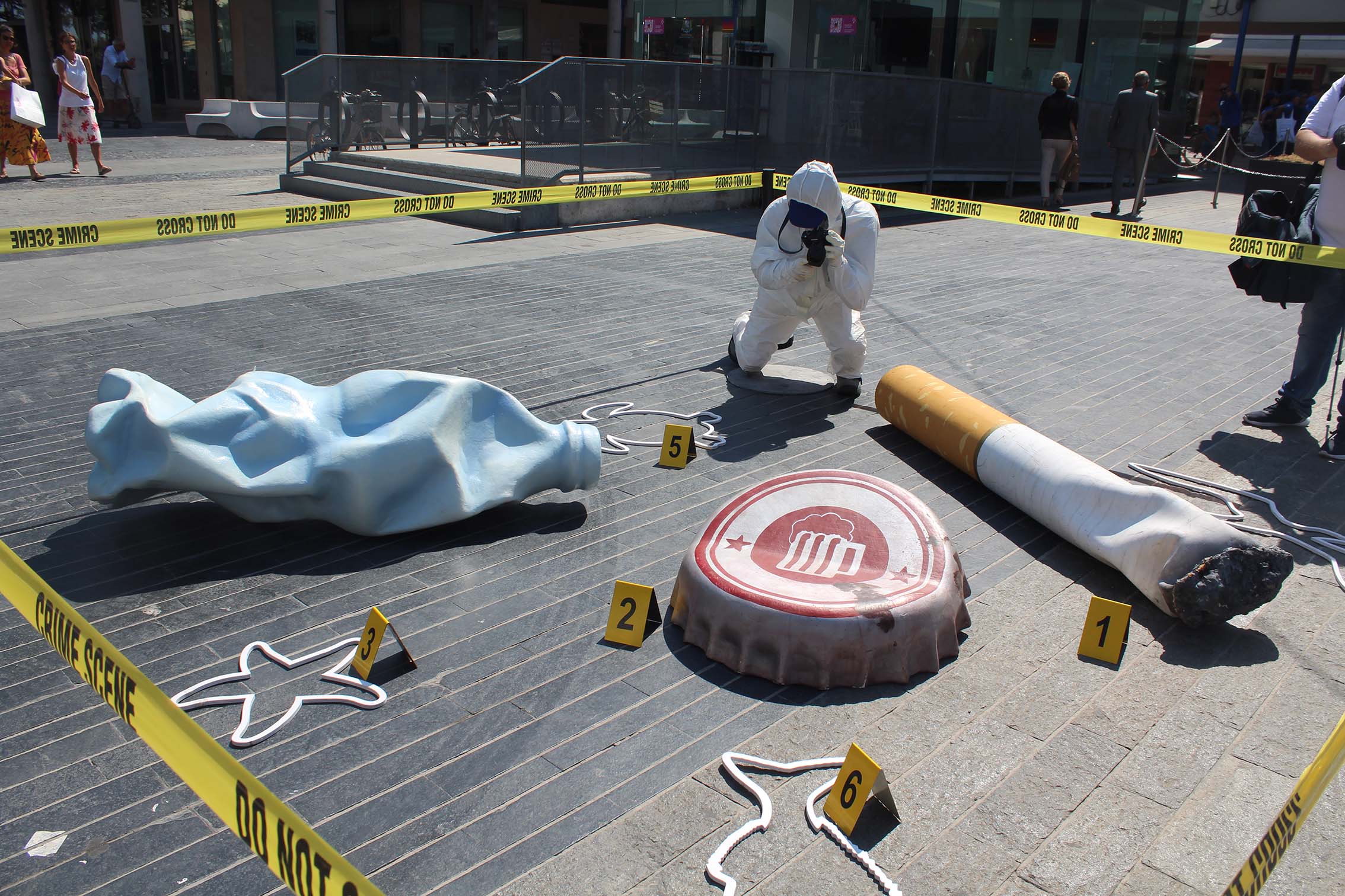 Proprio con l’obiettivo di accrescere sensibilità e consapevolezza sulle conseguenze di quel “piccolo gesto”, in Piazza della Rinascita (chiamata comunemente Piazza Salotto) – fino al 4 agosto una installazione rappresenterà una vera e propria “scena del crimine”, in cui, accanto alle sagome delle vittime raffiguranti tartarughe, pesci e altri animali marini, è posta la riproduzione di un mozzicone gigante, una bottiglietta di plastica e un tappo di alluminio come simboliche “armi del delitto”.