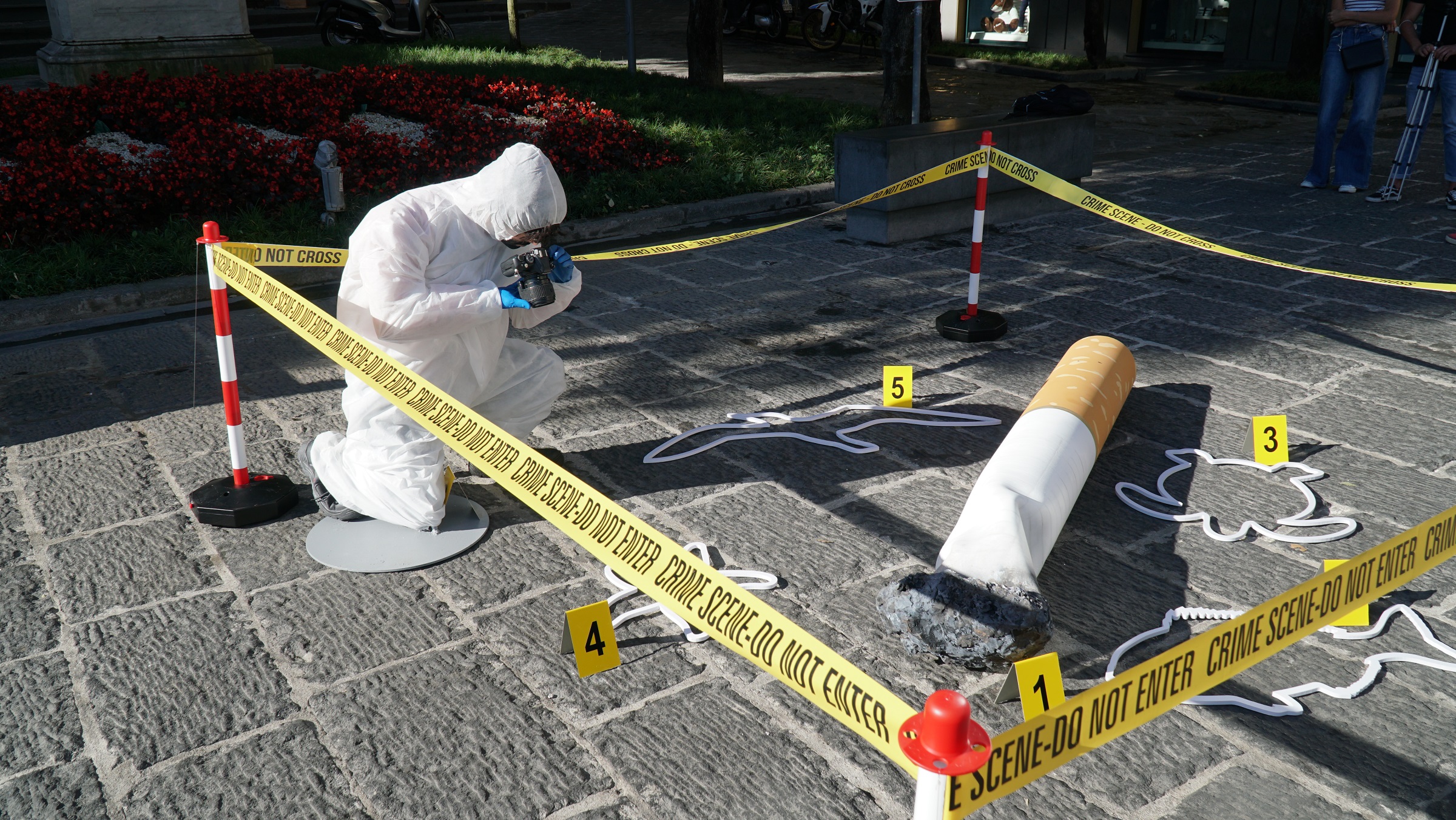 Il progetto, ideato e realizzato dall’agenzia creativa Question Mark Communication, prevede, oltre alla campagna advertising, l’installazione di una vera e propria «scena del crimine» in cui, accanto alle vittime – raffigurate da sagome di pesci, tartarughe e stelle marine – è stata posta la riproduzione di un mozzicone gigante, simbolica arma del delitto. Una “scena” che evidenzia la grandezza di un problema di tutti, quale l’inquinamento, dovuto a piccoli gesti di ciascuno, come quello di gettare a terra un mozzicone. L’installazione ricorderà così ai passanti l’importanza di non rendersi autori di un “crimine”.