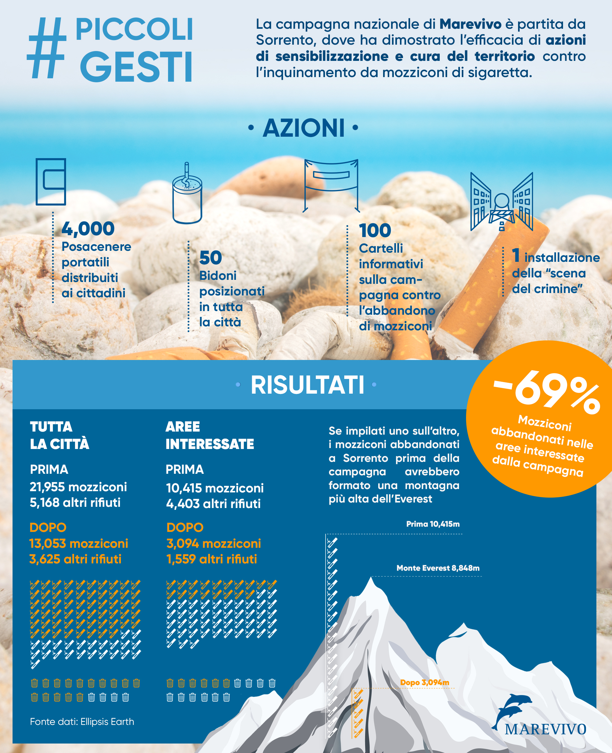“Se non smaltiti correttamente i mozziconi di sigaretta rappresentano un danno enorme per l’ambiente: sono i rifiuti più frequenti sulle spiagge, rilasciano sostanze nocive nel mare, il loro filtro non è biodegradabile, si sminuzza in microplastiche e rimane in mare per sempre” ha dichiarato Raffaella Giugni, Responsabile Relazioni Istituzionali di Marevivo. “I risultati di questa prima tappa sono incoraggianti: nell’area di Sorrento durante la campagna abbiamo ottenuto una riduzione complessiva dei mozziconi nell’ambiente pari al 69%. Se tutti i comuni italiani aderissero al nostro appello, e se le persone si impegnassero a smaltire correttamente questo rifiuto, risparmieremmo all’ambiente non solo marino un ulteriore aggravamento delle sue condizioni.”