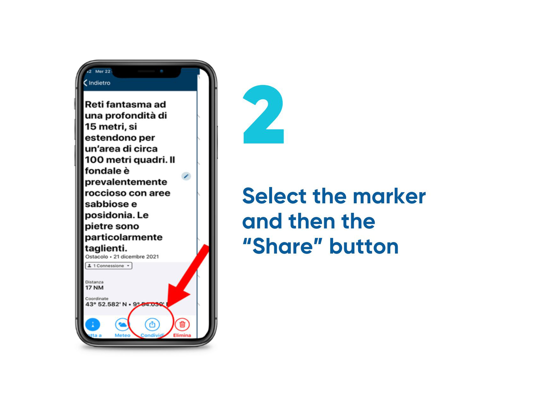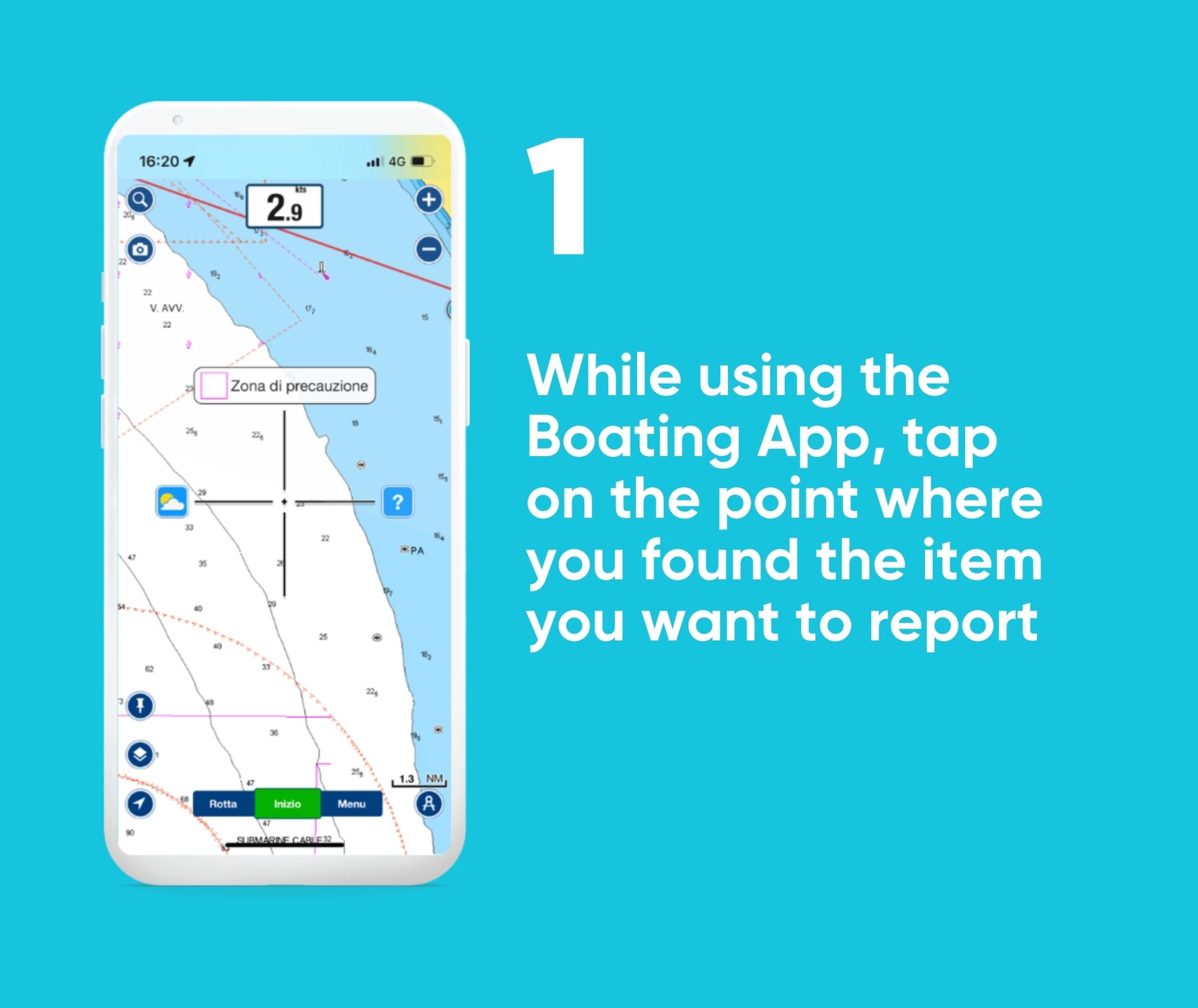 You can report it to Marevivo by using the “CONNECTIONS” feature of the Navionics Boating App