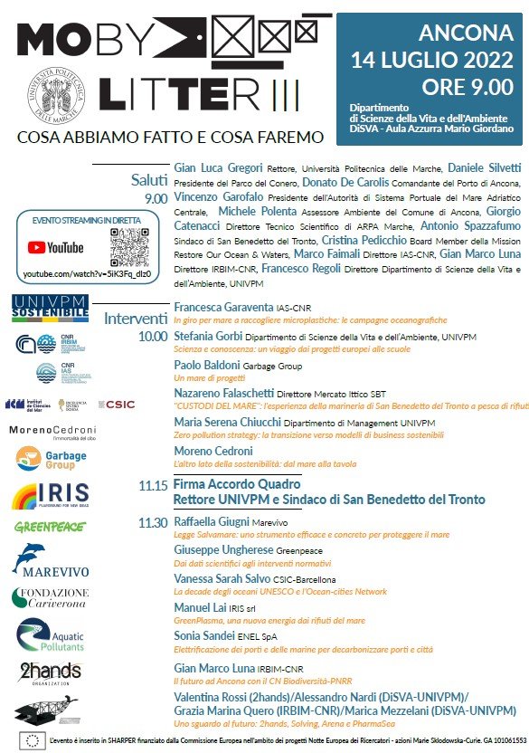 Giovedì 14 luglio saremo ad Ancona per il progetto Moby Litter, presso il Dipartimento di Scienze della vita e dell’Ambiente DiSVA – Aula azzurra Mario Giordano dalle ore 9.00.