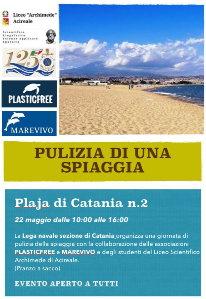 Domenica 22 maggio si svolgerà la pulizia della Plaja di Catania n.2, organizzata dalla Lega Navale Sezione di Catania in collaborazione con Marevivo Sicilia, l’Associazione Plastic Free e il Liceo Scientifico Archimede di Acireale.