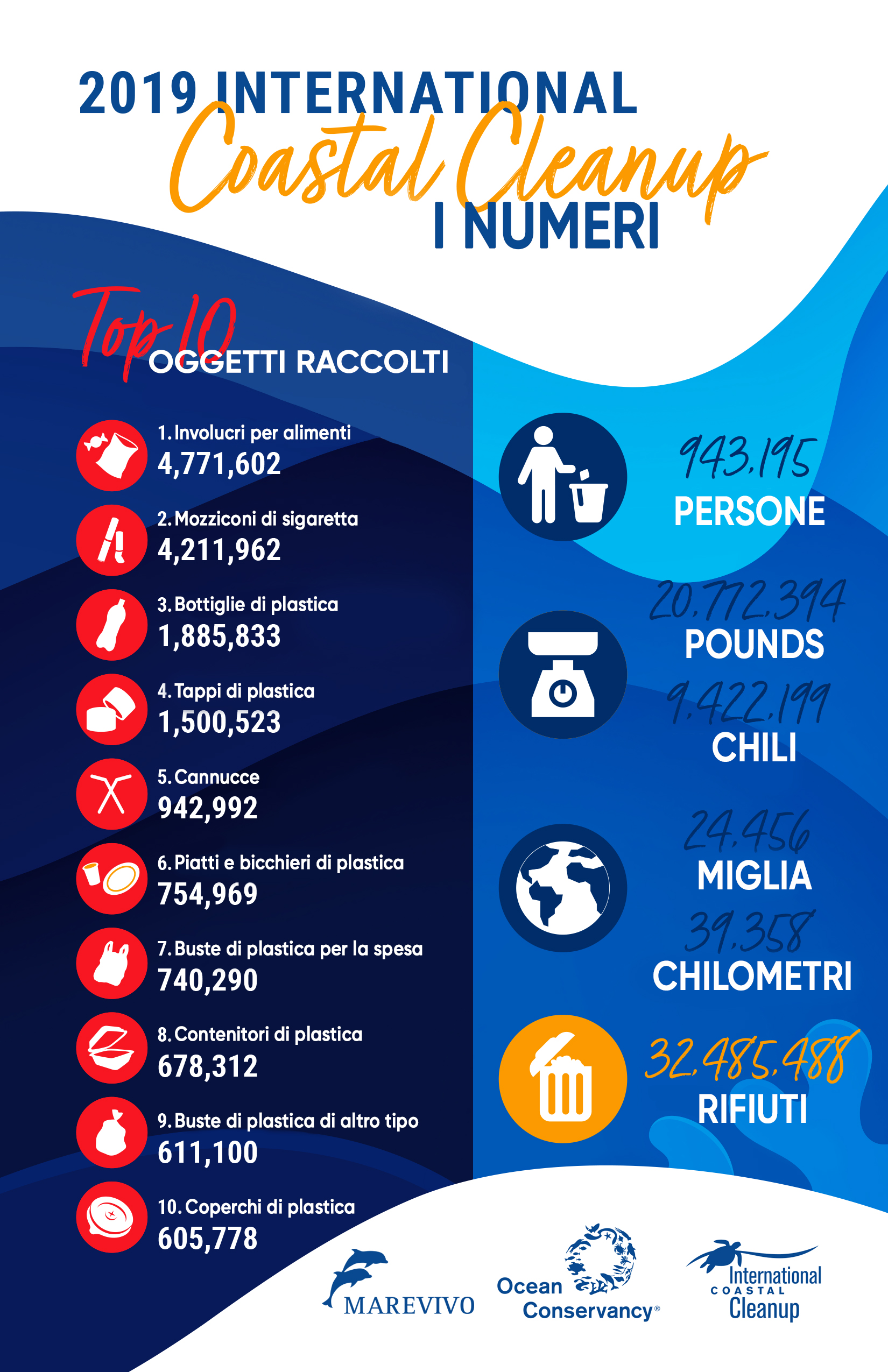 Marevivo collabora con l’associazione internazionale Ocean Conservancy per l’International Coastal Cleanup, un evento annuale e globale per raccogliere dati relativi ai rifiuti trovati sulle spiagge di tutto il mondo. Il nostro obiettivo è contribuire alla ricerca sull’inquinamento che Ocean Conservancy pubblica ogni anno.