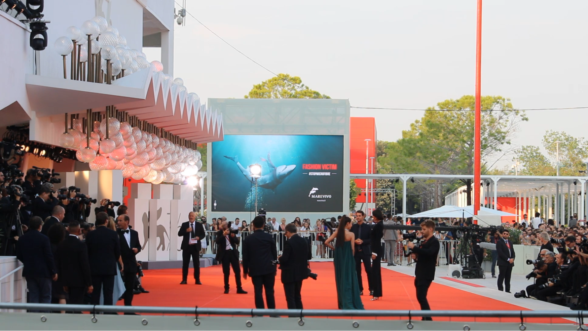 Sul grande schermo di fronte al red carpet sono state proiettate le immagini del video #StopSingleUsePlastic – Non c’è più spazio per fregarsene per sensibilizzare contro l’uso delle plastiche monouso. È stata poi trasmessa anche la campagna #StopMicrofibre – Per il mare ogni lavaggio è una tortura sul problema delle microplastiche rilasciate dai tessuti sintetici in lavatrice.Â